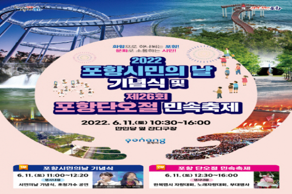 포항시는 오는 11일 만인당 옆 잔디구장에서 시승격 73주년을 맞아 ‘2022 포항시민의 날 기념식’과 ‘제26회 포항단오절 민속축제’를 동시 개최하며 시민들의 소통과 화합의 장을 마련한다고 밝혔다. 포항시는 오는 11일 만인당 옆 잔디구장에서 시승격 73주년을 맞아 ‘2022 포항시민의 날 기념식’과 ‘제26회 포항단오절 민속축제’를 동시 개최하며 시민들의 소통과 화합의 장을 마련한다고 밝혔다.