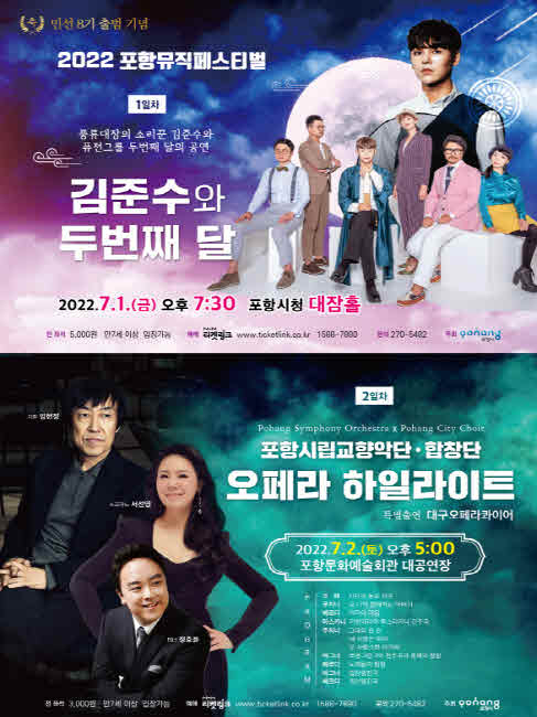 포항뮤직페스티벌은 지난 2016년을 시작으로 2019년까지 총 4회 개최됐으나, 2020년부터 불어 닥친 코로나19 여파로 2년 동안 열리지 못하다가 올해 다시 개최된다. 페스티벌 1일차인 7월 1일 오후 7시 30분 포항시청 대잠홀에서 열리는 공연은 ‘김준수와 두번째 달’이다. 국악 아이돌 TV 오디션 프로인 ‘풍류대장’에서 시청자들의 큰 사랑을 받은 국악 스타 김준수와 국내 최초 에스닉 퓨전 음악을 선보인 두 번째 달의 공연으로 관객들에게 즐거움을 선사할 예정이다. 현재 국립창극단 단원이자 국악계 아이돌, 판소리계 프린스라고 불리는 소리꾼 김준수는 2009년 국립극장 ‘차세대 명창’으로 선정됐다. 2013년에는 ‘동아국악콩쿠르’에서 판소리 금상을 받았으며, 2015년 ‘남도민요 전국 경창대회’에서 문체부장관상인 일반부 대상을 수상했고, 2017년과 2020년에 문체부장관 표창, 2021년에는 KBS 국악대상 판소리상 및 대상을 수상했다.
