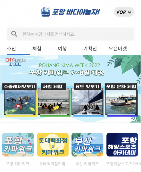 해양스포츠 관광도시로 거듭나고 있는 포항시는 여기저기 산재해 있던 해양스포츠 관련 정보를 한 번에 만나볼 수 있는 앱(APP), ‘포항 바다야 놀자’를 출시했다고 23일 밝혔다. ‘포항 바다야 놀자’는 해양스포츠아카데미, 서핑 공공스포츠클럽, 조종면허시험장, 대한민국 국제해양레저위크(KIMA WEEK) 등 포항시에서 제공하는 강습과 체험 프로그램 뿐만 아니라 다양한 기획전과 여행상품, 인기 있는 액티비티 등을 소개하며 사용자들의 눈길을 끌고 있다.