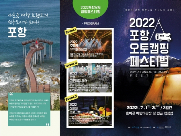 포항시가 새로운 여행트렌드로 부상한 낭만캠핑을 찾는 여행객을 사로잡기 위해 캠핑콘텐츠와 천혜의 해양관광자원을 접목한 ‘2022 포항오토캠핑 페스티벌’을 7월 1일부터 3일까지 호미곶 해맞이광장 일원에서 개최한다.