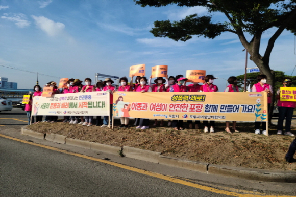 포항시여성단체협의회는 지난 7일 이른 아침 형산로타리에서 32개 단체 회원 60여명이 참여한 가운데 지역사회 여성폭력 근절을 위한 인식 개선 캠페인을 실시했다. 이날 캠페인에 참여한 여성단체 회원들은 최근 발생한 지역 내 성폭력 사건은 낮은 성인지 감수성을 가진 성차별적 문화가 성폭력 사건으로 이어졌다는데 인식을 같이하고, 지역사회의 성인지 감수성 제고를 위해 포항을 대표하는 여성단체로서 그 역할을 다하고자 직접 길거리에 나섰다고 밝혔다. 또한 남성중심의 기업문화가 만연해있는 지역사회에 앞으로 이와 유사한 사례가 발생하지 않도록 하는데 앞으로 여성단체가 기여하겠다는 의지를 밝혔다.