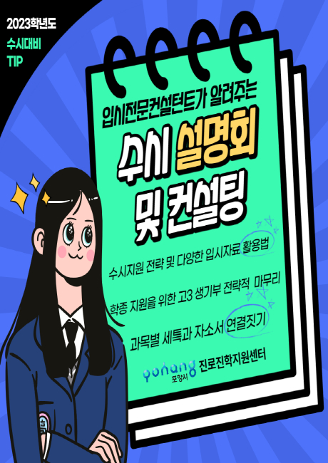 포항시 진로진학지원센터는 지난 6월 개최된 ‘포항시 2023학년도 대학진학박람회’가 한 곳에서 다양한 대학 정보 수집을 할 수 있다는 점에서 큰 호평을 받은 데 이어 개별 맞춤형 대입상담에 대한 학생 및 학부모들의 요청으로 여름방학 전 생기부 마무리와 수시 원서 접수를 앞둔 수험생들을 위해 입시전문가를 초청해 수시컨설팅을 준비했다.