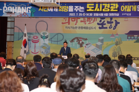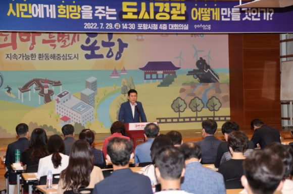 포항시는 29일 시청 대회의실에서 ‘시민에게 희망을 주는 도시경관, 어떻게 만들 것인가?’라는 주제로 도시경관 향상을 위한 대토론회를 개최했다. 이날 대토론회에서는 건축사, 광고업 관계자, 공무원 및 시민 등 100여 명이 참석한 가운데, 해안경관, 건축물 미관 개선방안, 유니버설디자인 정책화 방안 등 포항시의 도시경관을 향상시킬 수 있는 방안에 대한 논의를 진행했다. 첫 번째로 권경주 유니에코도시환경디자인연구소 대표가 포항의 명소를 중심으로 해안경관의 현황을 설명하고, 포항 해안경관의 방향을 ‘청정한 바다’, ‘쾌적한 바다’, ‘스마트 바다’로 설정해 해안경관 형성 방안을 발표했다. 이어서 이은형 대한건설정책연구원 연구위원은 건축물의 미관개선방안으로 강변과 해변, 그리고 내륙별 가이드라인을 정해 특성화하는 내용을 설명했으며, 최령 서울특별시 유니버설디자인센터장은 유니버설디자인의 정책 도입을 통해 성별, 연령, 국적, 문화적 배경, 장애 유무에 관계없이 누구나 손쉽게 사용할 수 있는 공공과 민간부문 유니버설을 도입하는 방안을 발표했다. 패널토론에서는 권용일 대구한의대학교 교수를 좌장으로 장창식 대구대학교 교수는 유니버설디자인의 도입에 대해, 이진형 포항지역건축사회장은 건축물 미관 개선방안에 대해, 박상구 건축디자인과장은 해안경관 특화방안에 대해 질의와 열띤 토론을 이어갔다. 이강덕 포항시장은 “포항의 204km 해안선을 잘 활용해 자연과 조화로운 해안경관을 형성시키고 건축물 미관에도 적용한다면 도시의 가치와 품격을 드높이는 계기가 될 것이다”며, “이번 토론회를 발판으로 시설물에 유니버설디자인을 적용해 시민 모두에게 희망을 주는 디딤돌이 되게 하겠다”라고 밝혔다.