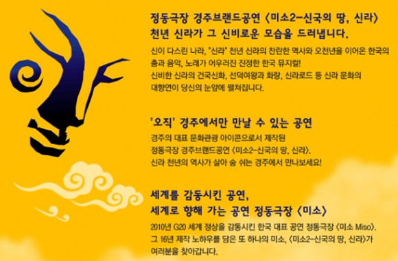 정동극장 경주브랜드공연 <미소2-신국의 땅, 신라>는 신라의 건국신화를 비롯하여 선덕여왕과 화랑, 삼국통일에 이르는 천년 신라의 찬란한 이야기를 70분 동안 보여주는 가무악극으로 7월 1일 개연한 지역 최초의 상설공연이다. 경주세계문화엑스포 문화센터 공연장에서 월요일을 제외하고 매일 저녁 7시 30분에 공연되고 있다.
