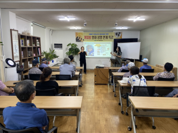 상주시(시장 강영석)는 18일 한국농아인협회 상주시지회 세미나실에서 청각장애인 20여 명을 대상으로 ‘가치봄 영화 상영 연계 특강’을 실시하였다. 이번 특강은 시·청각 장애인들을 위한 영화 상영 방식인 ‘가치봄’ 영화 상영과 연계한 평생교육 프로그램이며, 영화 이해를 돕고 장애인들의 인문학적 소양을 고취하기 위하여 기획되었다. 영화 ‘한산: 용의 출현’ 관람 전, 영화의 역사적 배경 설명을 중심으로 특강이 진행되었으며, 한국농아인협회 상주시지회측의 협조로 수어 또한 동시통역 되어 장애인들의 강의 이해를 도왔다.