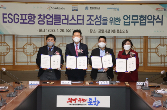 기업을 넘어 전 영역에서의 ESG 가치 반영이 요구되는 추세에 따라 철강도시에서 녹색생태도시로의 변화에 도전하고 있는 포항은 지난해 11월 ESG 선도도시 도약으로의 포부를 밝히며 ESG 선포식을 개최했고, 후속절차로 ESG 스타트업의 발상지로 자리매김하고자 올해 1월 세계적인 엑셀러레이터 스파크랩, 한동대학교, UNAI KOREA와 ‘ESG 포항 창업 클러스터 조성’을 위한 업무협약을 체결했다.