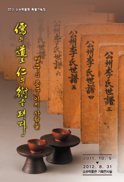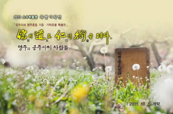 2011년 특별기획전 『儒의 道로 仁의 術을 펴다.』‘영주의 공주이씨 사람들’은 10월 5일부터~ 2012년 8월 31일까지 약11개월간 열리며, 개막식은 10월 5일 수요일 오후3시 김주영 영주시장, 김인환 영주시의회의장 및 공주이씨 문중 대표 등 각계각층의 인사들이 참석한 가운데 소수박물관 야외전시장에서 개최되며, 김태환 전 영주문화유산보존회장의 「영주의 공주이씨 문중과 유의儒醫 이석간李碩幹」에 대한 특별강연도 진행될 예정이다. |