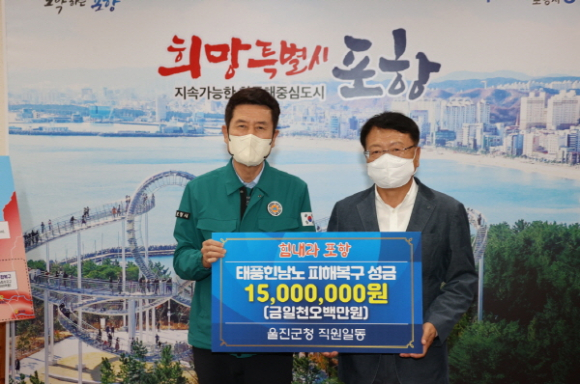 포항시에 따르면 지난 9일 연휴기간 중임에도 불구하고 울진군에서 포항을 찾아 피해지역 복구와 이재민 구호를 위해 성금 1,500만 원을 기탁했다.