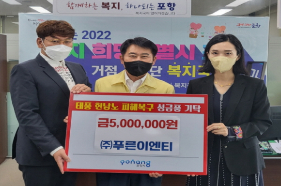 이승민 ㈜푸른이엔티 대표는 “태풍으로 피해를 입고 힘든 시간을 보내고 있는 수해민 분들에게 작게나마 위로가 되기를 바라는 마음으로 기탁하게 됐다”며, “용기를 잃지 않고 힘내셔서 빨리 일상을 회복할 수 있기를 기원한다”라고 밝혔다.