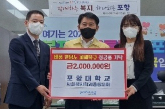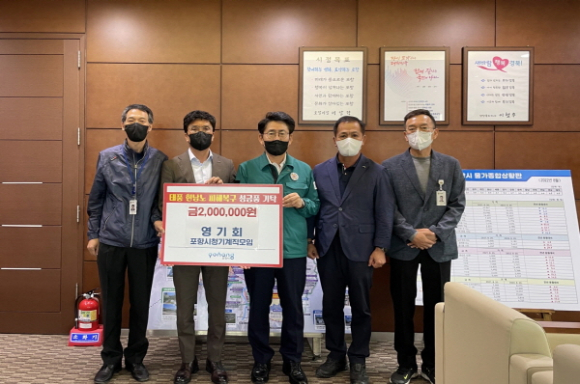 앞서 지난 7일에는 ㈜푸른이엔티(공동대표 이승민, 이윤경)에서 포항시청을 방문해 성금 500만 원을 기탁했으며, 포항시립합창단(지휘자 장윤정)에서 성금 200만 원, 영기회(포항시청기계직모임, 회장 탁헌수)에서 성금 200만 원, 포항대학교 사회복지학과 총동문회(회장 정기재)에서 성금 200만 원, 전자랜드 오광장점(지점장 김기웅)에서 500만 원 상당의 전기요 165대를 기탁했다. 이날 기탁된 성금과 후원품은 피해지역 복구와 이재민 구호에 사용될 예정이다.