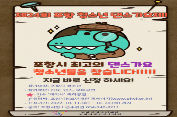 한편, 2022년 제24회 포항 청소년 댄스가요제의 자세한 내용은 포항시청소년재단 홈페이지(http://www.phyf.or.kr)에서 확인 가능하며, 문의는 포항시청소년재단 청소년수련관(☎240-9211)으로 하면 된다.