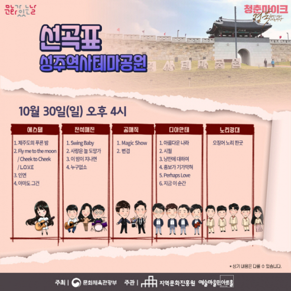 10월 문화가 있는 날 ‘청춘마이크 경북권’ 공연이 오는 30일, 성주역사테마공원에서 시원한 가을바람과 함께 펼쳐질 예정이다.