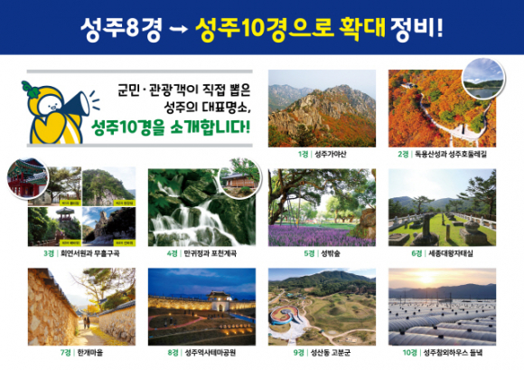 성주10경은 시대변화에 따른 트렌드와, 관광객으로부터 주목받고 있는 관광명소를 기존 8경을 포함해 새롭게 태어난 것으로, 지난 4월부터 전국민을 대상으로 제안 공모전을 실시해 제안된 종합의견을 반영하고 군민과 관광객을 상대로 2차에 걸친 선호도 조사로 대상지 선별을 거쳐 성주10경 위원회에서 최종 확정했다.