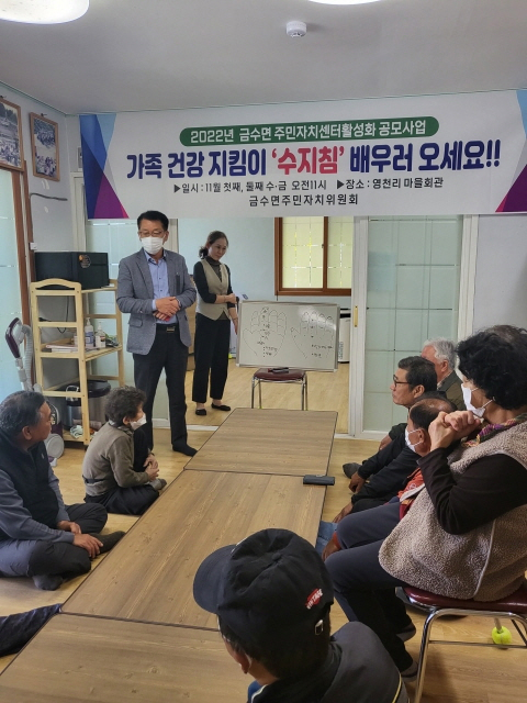금수면 주민자치위원회(위원장 김백규)는 11. 2(수) 오전11시, 영천리 마을회관에서 지역주민 20여 명이 참석한 가운데 「가족건강지킴이 수지침」강좌를 시작했다.