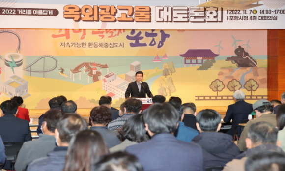 포항시는 7일 시청 대회의실에서 광고업 관계자, 건축사, 공무원 및 시민 등 100여 명이 참석한 가운데 도시 디자인 향상을 위한 ‘2022 거리를 아름답게, 옥외광고물 대토론회’를 개최했다. 이날 대토론회에서는 먼저 한국옥외광고정책연구소 김정수 소장이 벽보·전단·현수막 등 불법 유동광고물의 증가로 인한 도시미관 저해 및 시민생활불편에 따른 불법 광고물 근절방안에 대해 발표했다. 이어 이경아 동서울대학교 교수는 디지털 옥외광고로 특화된 국내 및 해외사례 소개와 간판이 특화된 거리 그리고 공공디자인의 주된 관리대상 등을 발표했으며, 이진구 한동대학교 교수는 디자인으로 도시를 바꾼다는 내용으로 조형물 및 실제 도시 간판 사례를 소개하고 간판개선사업 현황 등을 발표했다. 이와 함께 황현택 계명대학교 교수가 좌장으로 참여한 패널토론에서 △김진관 한국옥외광고협회중앙회 이사와 최기송 경상북도옥외광고협회 포항시지부장은 명함형 불법광고물 등 근절방안에 관해 의견을 냈으며, △장창식 대구대학교 교수는 간판개선사업 현황과 나아갈 방향에 관해 △박상구 건축디자인과장은 옥외광고물로 특화된 거리 만들기에 대해 질의와 열띤 토론을 이어갔다.