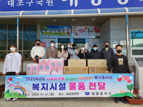 경북 고령군 쌍림중학교(교장 오세경) 봉사동아리는 ‘나날이 만보 걷(Go) 기(富)’활동을 통해 11월 21일(월)에 쌍림면 소재 ‘대창양로원’에 물품 기부 행사를 했다. ‘나날이 만보’ 봉사동아리 운영은 매일 일상에서의 걸음 수만큼 사회적으로 기부할 수 있는 앱 ‘빅 워크(bigwalk)’를 이용해 전교생 35명과 교직원 17명이 5월 4일부터 10월 5일까지(방학을 제외) 18주간 운영했다. 학생과 교직원은 매일 누적된 걸음 수를 매주 수요일 각 학년 체육부장이 누가 기록해 데이터를 축적했고, 10월 21일(금) 교내 체육한마당(체육대회)에서 기부 걸음 수 상위 10명에 대해 시상한 바 있다. 체육교사와 학생자치회에서 추진해 진행한 봉사동아리에서 학생과 교직원은 총 15,534,102보가 누적돼 155만원 상당의 금액을 앱을 통해 기부하게 된 셈이다. 이후 학교 예산을 이용해 고령군 쌍림면 소재의 대창양로원에 휠체어 2대, 휴지, 물티슈, 마스크 등 약100만원 상당의 물품을 상위 10명의 학생의 이름으로 기부하는 행사를 가졌다.