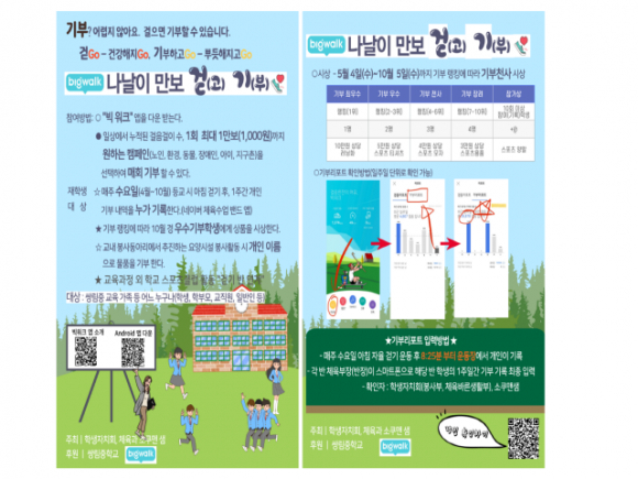 봉사동아리 운영자 김석만 체육교사는 "체력증진을 위한 걷기 운동을 보다 의미 있게 실시하고자 고민하던 중, 앱 기반 비대면 걸음기부 캠페인을 실현하는 빅워크 앱을 알게 돼 학생자치회와 함께 실시하게 됐다. 학생과 교직원의 자발적인 의미 있는 한걸음들이 모여 큰 가치를 만들 수 있는 부분에서 뿌듯함을 느꼈다"라고 했다. 또한 학생 중 63,576보로 가장 많은 걸음을 기부한 전교 학생부회장 권기현 학생(2학년)은 "기부라는 것에 대해 막연하였는데 걷기 활동만으로 기부를 할 수 있다는 점이 놀라웠고 보람을 가지게 되었다. 다 함께 참여한 친구들과 선생님들 모두에게 고마움을 느낀다"는 소감을 밝혔다. 빅워크(bigwalk)앱은 약 40여 개 기업과 공공기관 등과 파트너십을 맺고 기업 ESG 가치를 담은 유저 참여형 콘텐츠로써, 걸음 기부 캠페인, 미션챌린지, 공간 브랜딩 등 서비스를 제공한다. |
