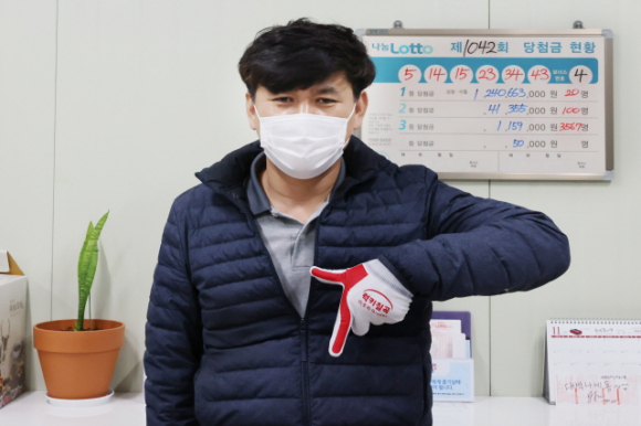 | ↑↑ 1등 7장을 판매한 칠곡군 북삼읍의 한 로또복권 사장이 럭키칠곡 포즈를 하고 있다 |