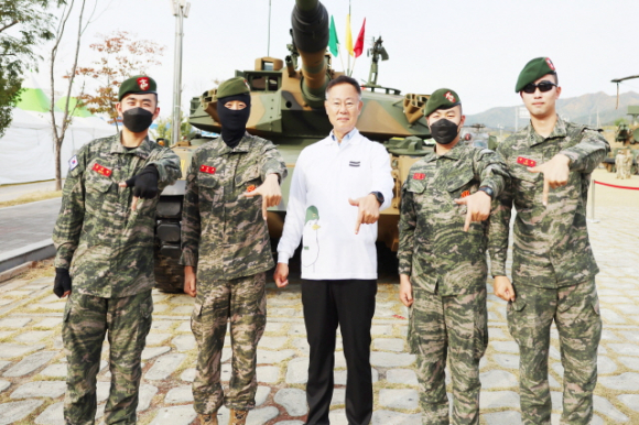 | ↑↑ 김재욱 칠곡군수가 해병대 장병들과 럭키칠곡 포즈로 기념 촬영을 하고 있다 |