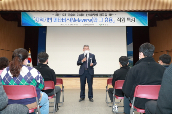 예천군(군수 김학동)은 8일 오후 4시 군청 대강당에서 직원들을 대상으로 ‘지역기반 메타버스와 그 효용’을 주제로 특강을 했다. 최성광 메타경북 민관합동추진위원장을 초빙해 △메타버스의 이해 △메타버스와 일상의 변화 △메타버스 구현 △지역 기반 메타버스 순서로 특강을 진행했다. 4차 산업혁명 핵심가치 중 하나인 메타버스는 국내‧외 기업 등에서 투자‧개발에 앞다투고 있으며 경상북도에서도 일찌감치 ‘메타버스 수도 경북’ 비전 선포 후 일련의 사업들을 추진하고 특히, 도내 23개 시‧군에서 활용할 수 있는 통합플랫폼을 개발 중이다. 김학동 예천군수는 “직원들이 신기술 등 최신 트렌드를 이해하고 이를 활용해 공공서비스와 각종 사업에 접목해 가치를 창출하길 바라고 이는 곧 군민들 삶의 질 향상으로 이어질 것.”이라 말했다.