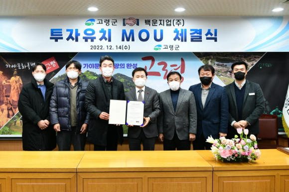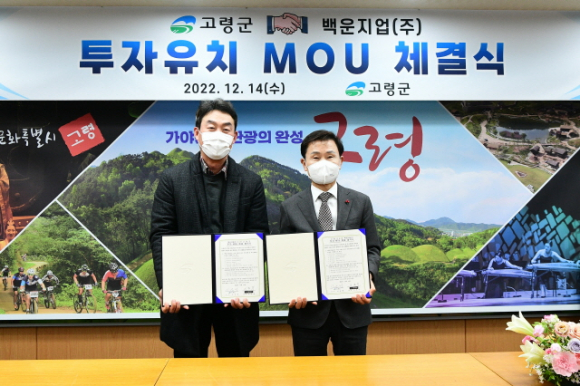 고령군(군수 이남철)은 12월 14일(수) 가야금방에서 백운지업(주)(대표 이한수)와 투자유치 MOU(업무협약)를 체결했다.