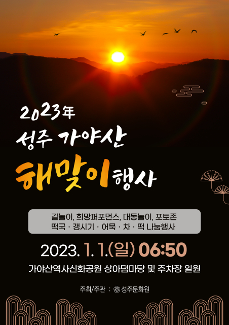 성주군은 계묘년(癸卯年) 새해를 맞아 2023년 1월 1일 성주의 대표 해맞이 명소인 가야산 역사신화공원 상아덤마당에서 「2023 성주 가야산 해맞이 행사」를 개최한다고 밝혔다.