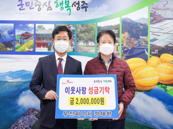 무진퍼니처 정재환 대표는 22일 성주군청을 방문해 저소득층을 돕기 위한 성금 200만원을 기탁하며 희망2023나눔캠페인에 동참했다.