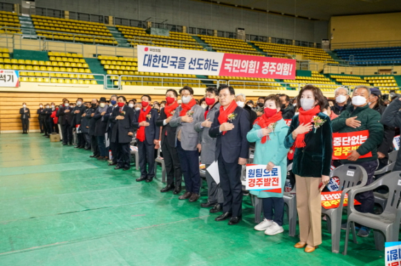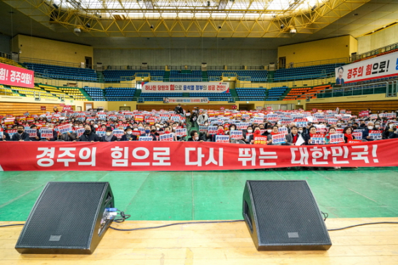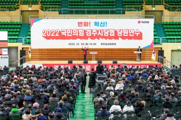 국민의힘 경주시 당원협의회(위원장 김석기 국회의원)은 12월 24일 오후 2시 경주실내체육관에서 당원 2,000여명을 대상으로 ‘2022 국민의힘 경주시당협 당원연수’를 개최했다. 개그맨 김종국 씨의 사회로 진행된 이날 행사에는 국민의힘 김기현 전 원내대표, 권성동 전 원내대표, 윤상현 전 사무총장, 나경원 대통령 직속 저출산고령사회위원회 부위원장, 황교안 전 당대표, 정미경 전 최고위원 등 국민의힘 주요 당권주자들이 참석해 축하의 인사를 전했고, 당원들과 소통의 시간을 가졌다.