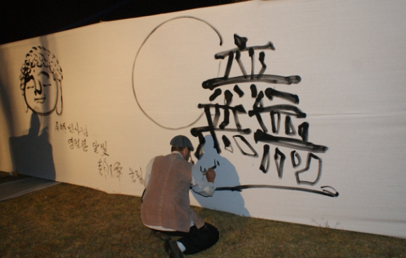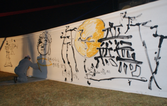 이날 최고의 볼거리는 깊어진 가을하늘에 소원 담은 풍등을 날려 올리고 원로 서예가이신 정담 조필제 선생의 불두와 여천 선생의 無로 그리는 문자탑, 김경수 화가의 힘 있는 붓의 터치, 목공예가 서승암 진행자의 구수한 우리가락에 참석자들은 장단을 맞추며 흥겨워했다.
