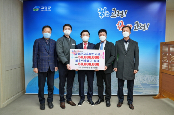 고령1일반산업단지(대구경북주물사업협동조합)에서 12월 27일(화) 고령군청을 방문해 교육발전기금 5천만원과 사랑의 성금 5천만원을 기탁했다.
