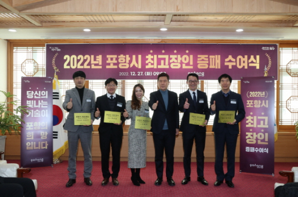 포항시는 27일 시청 대외협력실에서 ‘2022년 포항시 최고장인’으로 선정된 5명에게 최고장인 증서와 증패를 수여했다고 밝혔다.