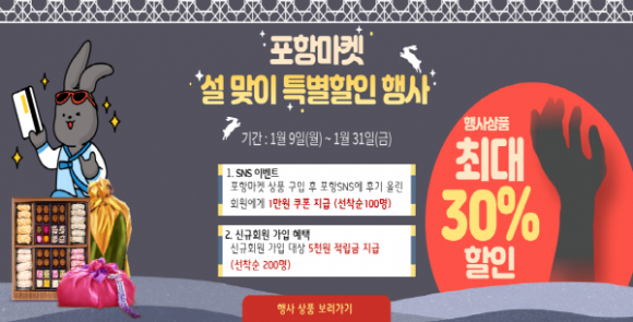 먼저, 포항시 우수 농수축산물 온라인 쇼핑몰인 ‘포항마켓’ 홍보와 지역 농특산물 소비 촉진을 위해 최대 30% 할인 프로모션을 진행한다. 행사 기간은 오는 1월 9일부터 31일까지이며, 예산 소진 시 조기 종료할 예정이다.