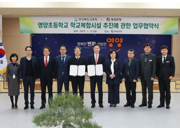 영양군(군수 오도창)과 경상북도교육청(교육감 임종식)은 13일 영양군청 대회의실에서 영양초등학교 시설복합화(공영주차장 조성) 사업에 관한 업무협약식을 가졌다. 이 날 협약식은 경상북도교육청(이하 도 교육청)의 주관으로 임종식 도 교육감을 비롯하여 이경 영양교육지원청교육장과 이승준 영양초등학교장 등이 참석했고, 영양군에서는 오도창 군수와 영양군의회 김석현 의장, 박홍열 경상북도의원 등 10여명이 참석한 가운데 진행됐다. 영양초등학교 시설복합화 사업은 학교운동장 지하에 주차면수 120면 이상의 대형 공영주차장을 건립하는 경북도내 최초 사례로 교육청이 약 4,600㎡의 부지 제공과 사업을 시행하고, 영양군에서 100억원 정도의 사업비 지원과 향후 사용·관리를 함으로써 학교와 지역사회가 서로 윈-윈(win-win)하는 수범적인 사례가 될 것으로 보인다. 영양군은 지속적인 차량 증가와 도심지의 불법 주․정차 차량으로 주민들의 통행불편과 보행자의 안전사고 발생 위험이 높아 대형주차장 건립이 꼭 필요한 상황이었으나 다년간의 노력에도 부지 마련이 쉽지 않았으나 영양초등학교 시설복합화 사업 추진 계획 소식을 접하여 경상북도교육청과 영양군의회의 협조로 본 협약식을 가지게 되었다.