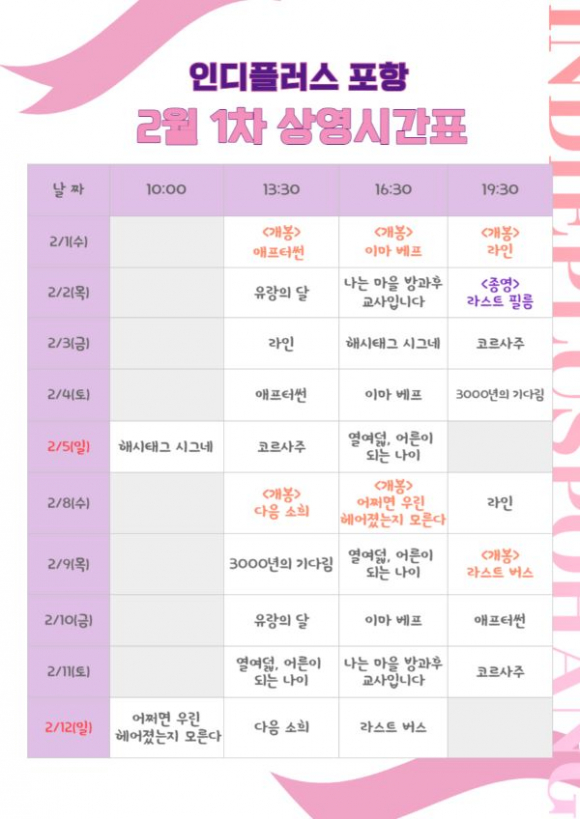 | ↑↑ 인디플러스 포항 2월 1차 상영시간표 |