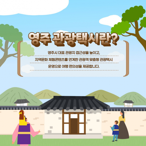경북 영주시가 대중교통을 이용하는 개별 여행객들에게 맞춤형 관광편의를 제공하기 위해 올해 ‘영주 관광택시’를 15일부터 운영한다. 시는 단체 방문객보다는 가족·친구 단위의 소규모 관광으로의 관광패턴 변화에 대응하고 다양한 관광수요 충족을 위해 영주 관광택시를 2020년 7월부터 운영해왔다. 이용대상은 관외 주민등록이 된 관광객으로, 여행 5일 전 영주시 문화관광 인터넷 홈페이지를 통해 4시간, 또는 6시간 코스를 선택해 사전 예약하면 이용할 수 있다. 올해 영주 관광택시는 15대가 운영된다. 이용 요금은 4시간 코스 8만 원, 6시간 코스 12만 원, 추가 1시간당 2만 원으로 시에서 50% 지원해 여행객은 50%만 부담하면 된다. 올해는 6시간 코스가 추가돼 이용객들은 보다 여유로운 관광을 즐길 수 있게 됐다. 올해로 운영 4년째를 맞는 영주 관광택시는 그동안 연간 1천여 명이 넘는 관광객들이 이용하며 큰 호응을 얻어 왔다. 시는 코로나19로 소규모 관광이 확산하고 KTX-이음과 관광택시를 연계한 소규모여행 상품이 출시되면서 이용객이 증가한 것으로 보고 있다. 이용객들은 맞춤형 편의 제공으로 관광객들이 원하는 관광명소, 영주 맛집 등을 방문할 수 있다는 점이 영주 관광택시의 최대 장점으로 꼽는다. 또 택시 기사들의 친절한 응대로 관광택시 이용객을 대상으로 한 설문조사 결과 실제 이용자들의 만족도가 높게 나타났다.