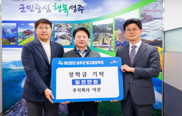 지난 14일 ㈜이산에서 (재)성주군별고을장학회를 찾아 지역인재를 위한 장학금 1천만원을 기탁했다.