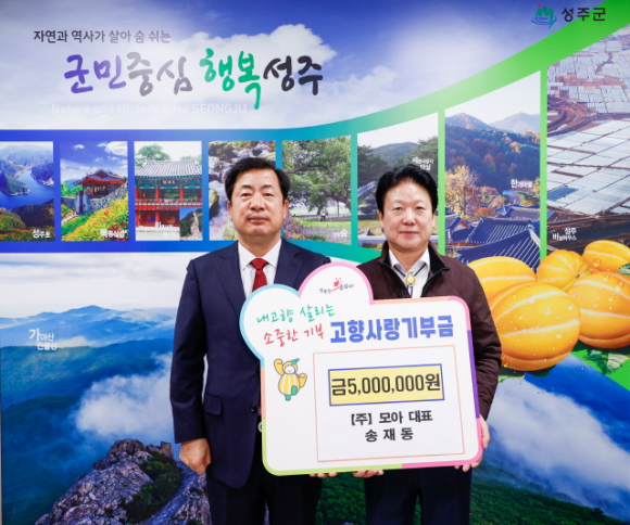 성주군은 2월 23일, ㈜모아 대표 송재동씨는 성주군에 고향사랑기부금 최고액인 500만 원을 기부했다. 선남면 문방공단 내 고기능성 플라스틱 전문 제조업체인 ㈜모아의 송재동 대표는 매년 이웃사랑 실천을 하며 지역사회에 꾸준한 나눔으로 주변의 귀감이 되고 있다.