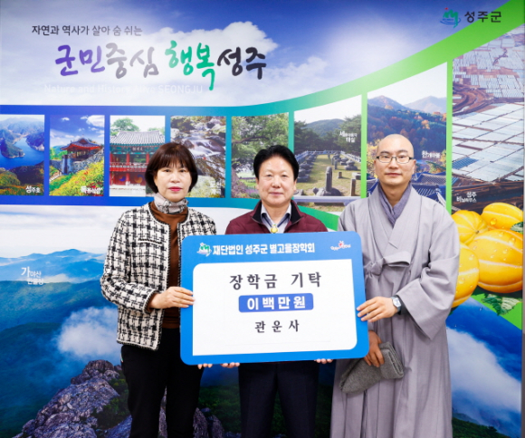또한 24일 장학금을 기탁한 대한불교조계종 관운사(대표 징암스님)는 성주읍 경산리에 위치해 지역 곳곳에서 어려운 이웃을 위해 봉사활동을 몸소 실천하고 있는 사찰로, 올해는 바자회 사업 등을 통해 모금한 성금으로 장학금 기탁을 한 것으로 알려져 주위의 귀감이 되고 있다.