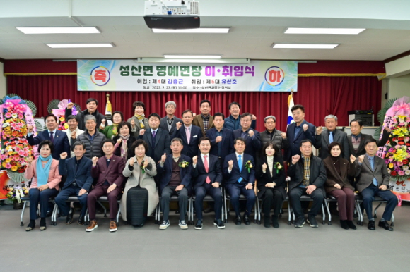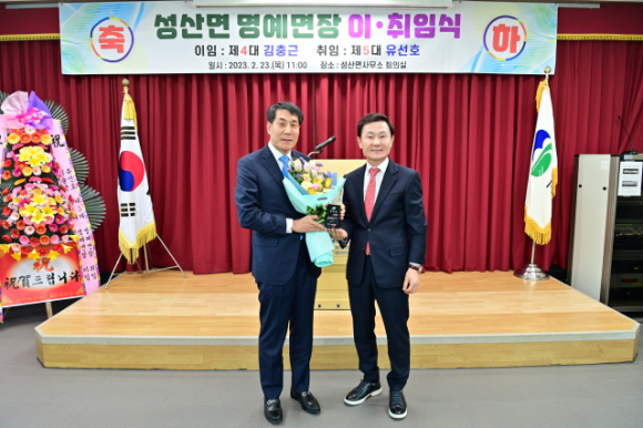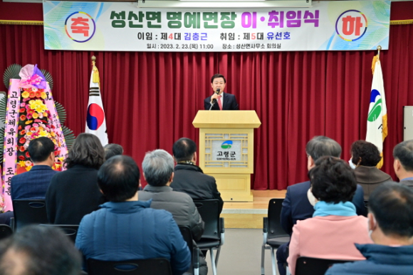 고령군(군수 이남철)은 2월 23일(목) 11시 성산면사무소 회의실에서 기관 및 사회단체장, 이장·새마을지도자 등 100여 명이 참석한 가운데 성산면 명예면장 이·취임식을 가졌다. 제4대 김충근 명예면장이 이임하고 제5대 유선호 명예면장이 취임했다. 제4대 김충근 명예면장은 성산면 기족리 출생으로 2017년11월 취임한 이후 5년간 성산면 명예면장으로 재임 해왔다. 김충근 전 명예면장은 이임사를 통해 “5년여 동안 성산면민 모든 분들이 편하게 잘 대해 주셔서 잘 마칠 수 있었다. 신임 명예면장님 중심으로 화합하는 성산면이 되었으면 좋겠다”고 말했다.