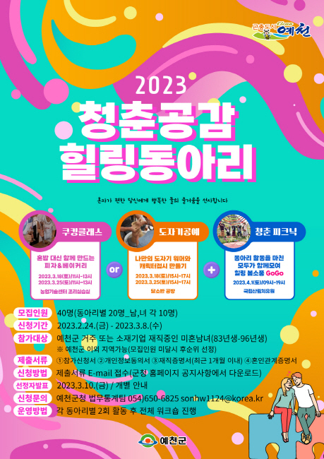 예천군(군수 김학동)은 3월 8일까지 미혼남녀에게 소중한 인연을 만들어 주기 위해 ‘청춘공감 힐링 동아리’ 참가자 남녀 각 20명 총 40명을 모집한다.