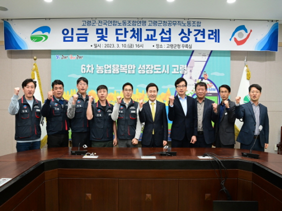 고령군(군수 이남철)은 3월 10일(금) 16시 고령군청 우륵실에서 전국연합노동조합연맹 고령군청공무직노동조합과 기관․노조측 교섭위원 10명이 참석한 가운데 임금 및 단체교섭 본교섭 전 상견례를 가졌다. 이번 상견례는 경과보고, 양측 교섭위원 소개, 대표 교섭위원 인사말, 기념촬영 순으로 진행됐다.