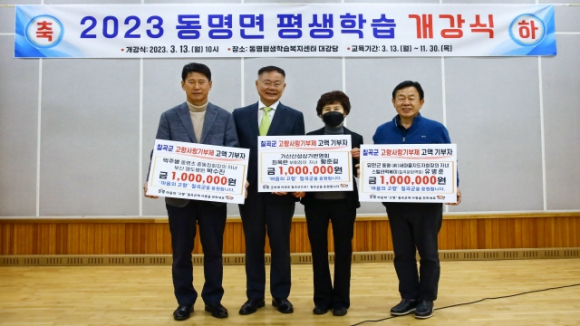 한편, 지난 13일(월) 동명면 평생학습복지센터 개강식에 앞선 기탁식에는 바쁜 직장생활로 인해 주인공들의 부모님들이 참석해서 기념촬영을 가졌다. |