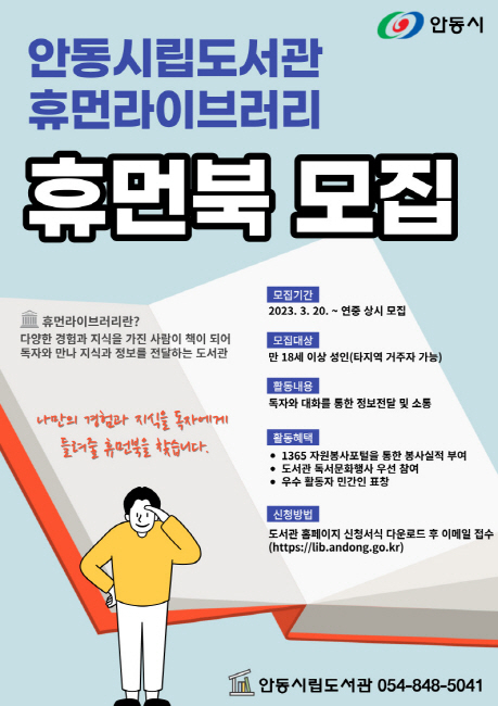 휴먼북 활동은 5월 중 ‘휴먼라이브러리 발대식’을 시작으로 1인 이상의 독자가 원하는 휴먼북을 신청하면 안동시립도서관(중앙·웅부·어린이) 내에서 대면 열람하는 방식으로 진행된다.