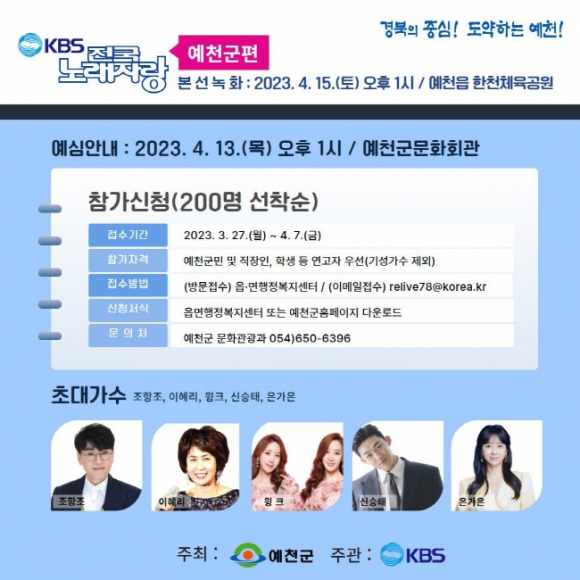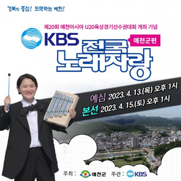 예천군(군수 김학동)은 오는 4월 7일까지「KBS 전국노래자랑 예천군편」예심참가 신청을 받는다. 국내 최장수 프로그램인 KBS 전국노래자랑은 제20회 예천아시아 U20육상경기선수권대회 개최를 기념해 2016년 이후 7년만이며, 오는 4월 15일 한천체육공원 특설무대에서 개최될 예정이다. 예심참가는 군민은 물론 직장인, 학생 등 누구나 참여할 수 있고 읍‧면행정복지센터를 직접 방문하거나 예천군 홈페이지에서 신청서를 다운받아 이메일(relive78@korea.kr)로 접수하면 된다. 예심은 13일 오후 1시 예천군문화회관 대공연장에서 열리며 이날 본선에 진출할 15개 팀을 선발하고 본선 녹화에는 개그우먼 출신 김신영 MC의 재치 있는 입담과 함께 조항조, 이혜리, 윙크, 신승태, 은가은 등 인기가수가 출연해 신나는 무대를 장식한다.