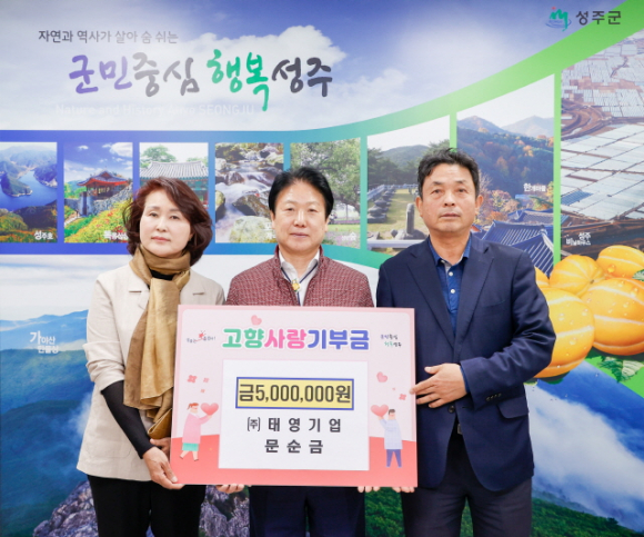 성주군은 4월 12일, (주)태영기업 대표 문순금씨는 성주군에 고향사랑기부금 최고액인 500만원을 기부했다.