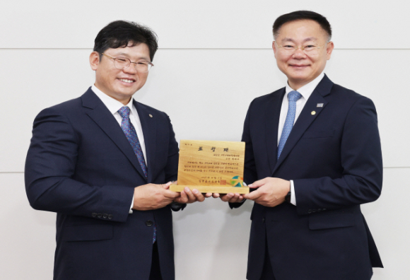| ↑↑ 김재욱 칠곡군수와 표창패를 받은 한광수 칠곡군테니스협회장이 기념 촬영을 하고 있다 |
