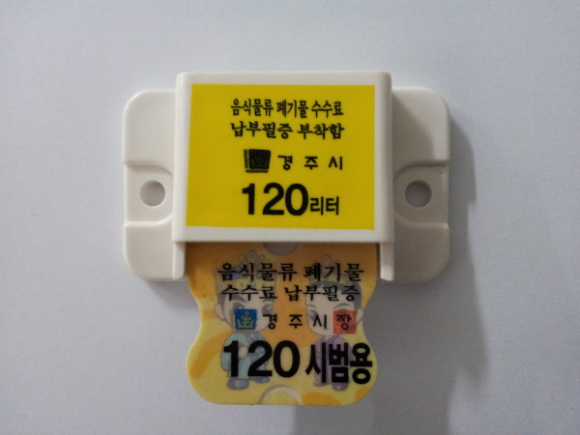 납부필증(칩)은 1회 배출용으로 매회 음식물 쓰레기를 수거해 갈 때 함께 제거된다. 판매가격은 3리터 120원, 5리터 200원, 20리터 800원, 60리터 2,400원, 120리터 4,800원으로 리터당 40원이다.