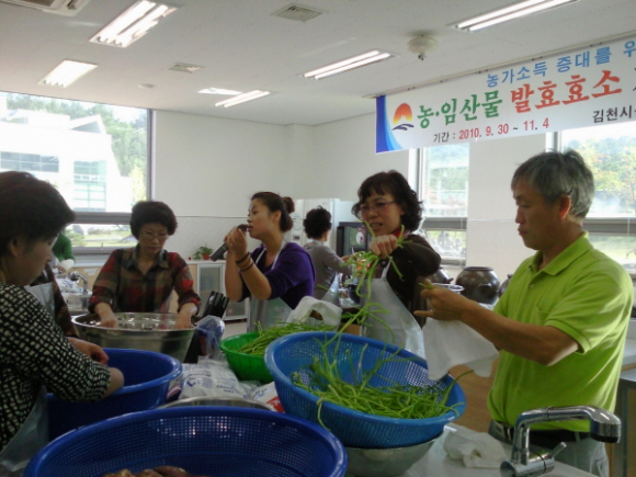 김천시는 2011년 풍요의 계절, 가을을 맞이하여 김천 관내에 생산되는 농산물을 대상으로 지난 6일부터 4회에 걸쳐 농업기술센터 농촌생활교육관에서 시연을 통한 발효효소교육을 실시했다. 시연 품목은 오미자·사과·배·감·도라지·인삼·수세미 등 7종이며, 제조방법, 관리방법, 음용방법 및 오행을 통한 건강관리까지 발효효소와 관련된 다양한 내용으로 교육을 추진했다.