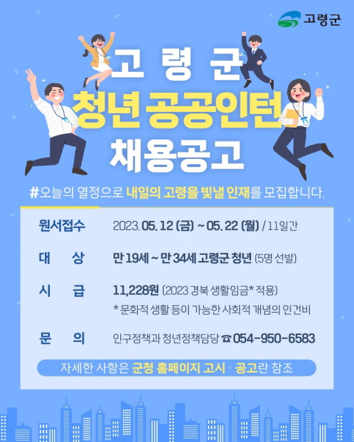 고령군(군수 이남철)은 5월 12일부터 21일까지 11일간 ‘청년일자리 공공 인턴사업’ 참여자 5명을 모집한다.