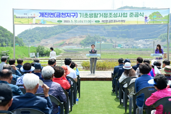고령군은 5월 10일 11시 개진면 금천 온누리 마당에서 이남철 군수, 김명국 군의회의장을 비롯한 군의원, 노성환 도의원, 관내 기관·사회단체장, 주민 등 200여 명이 참석한 가운데 ‘개진면 (금천지구) 기초생활거점조성사업 준공식 기념행사’를 개최했다.
